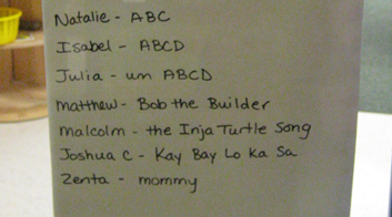 今天下午到學校接小涼,看到他教室外面貼的每日一問。今天老師問的問題是: “What song do you like to sing?” 結果大部分的小朋友都是回答 ABC,Twinkle twinkle little star 或是 Bob the builder 等等。結果小涼的答案是: