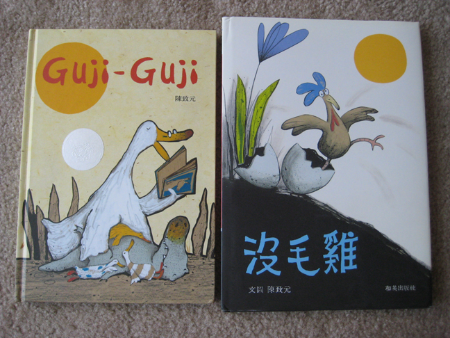 另外,沒毛雞這本書的中文部分還有注音符號。Guji Guji 雖然沒有注音,不過文字的編排很清𥇦。很適合小朋友看。因為這兩本書,小涼會認了「沒毛雞」,「大」「小」「尖」「天」「人」等中文字。