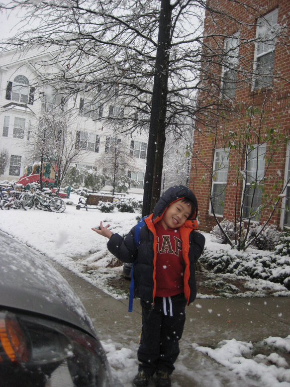 早上七點多他就醒來在等下雪,而我和他爸只是躺在床上賴著說,九點才會下啦!!好吧,這下小涼改成「報時」,由於他會看電子鐘,所以他就一直報著現在幾點幾分了,快下雪了,所以我們還是沒法好好睡。好不容易到九點了,小涼就又跑去看窗外到底下雪了沒,然後他說「有下了,可是下的是什麼呀?」我起床一看,原來下的是小雪和小雨的mix,難怪小涼覺得很疑惑。一直到覆蓋了層白白的雪在車頂,小涼才覺得比較有真實感!!