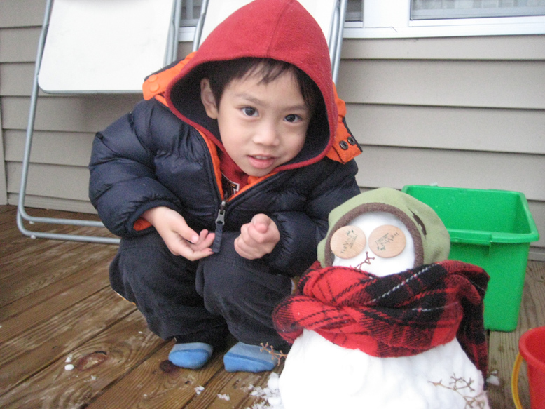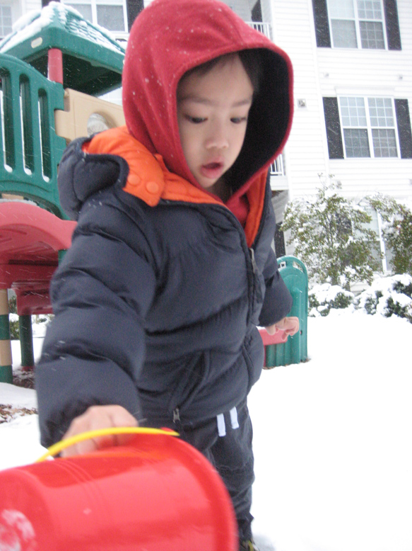 中午和小之一家,及遠道而來的Annie, Darcy一起在半畝園吃了頓溫馨的午餐後,小涼就開始哇哇叫著要玩雪。不過Ken因為沒睡好,一副很累想補眠的樣子。。。。我答應小涼晚一點帶他挖點雪回家作雪人之後,他又更急了,三不五時就拿著水桶來找我說要去挖雪........真的是很「執著」還和我說,「媽媽,妳一直說晚一點要帶我去,可是都沒有帶我去呀!!!」唉,就「晚一點」還沒到呀。後來直接和他說「四點」。而且說四點以前不可以再吵著要出門了,他才比較安分一點。一到四點,他就閃電的穿戴好喊著要出門了(平時上學有這麼迅速就好了)。於是我帶他到樓下的playground去挖雪,帶到我們的窗台上來作雪人。真是凍呀!!!