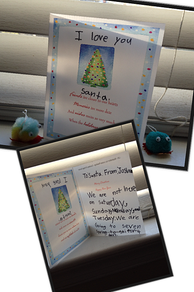 24日是我們出發去度假的日子, 小涼一早起床, 就嚷著, 媽咪, 卡片在哪裏? 我要寫卡片給 Santa. 我在睡夢中迷迷糊糊的聽到他邊寫邊唸, 告訴 Santa 我們這幾天不在家. ..然後他把卡片放在窗台. 接著我們就出發去度假了.