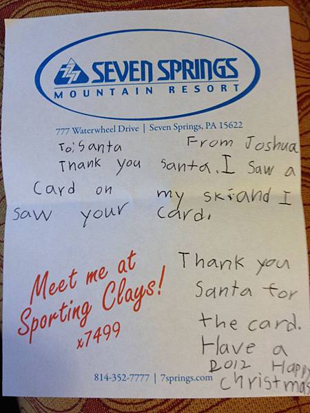 25日一早, 小涼很早就起來了, 他一下就發現在他的ski上有夾一張卡片!! Santa 留了張很漂亮的卡片給他, 告訴他他今年很棒, 也收到很多的禮物, 希望他有個美好的聖誕節, 明年也要一樣棒. 小涼收到卡片超級開心, 說'我就知道Santa有看到我留給他的卡片'. 然後他又留了張字條給 Santa 說" 謝謝 Santa, 也祝 Santa 有個 快樂的聖誕節'.. 我看到這幕覺得, 原來這小美國人真的很愛寫 "Thank you card "
