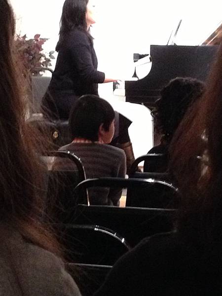 今天我們提早半小時到了表演場地, 發現小涼這一場表演是今天的第二場, 在等待前一場結束前, 剛好有些空檔. 找了個琴房, 小涼開始練習. 結果小涼緊張到手發抖.我心想, 還好有早到, 讓他暖身一下. 後來表演開始, 這一場表演有 13 位表演者, 小涼是第三位出場的小朋友, 也是唯一一位表演古典吉他的. 其它的大多是小提琴和鋼琴. 在輪到小涼表演前, 我也緊張到不行. 不過, 小涼看起來緊張歸緊張. 他一上台還蠻鎮定的感覺. 整體表演不錯!!